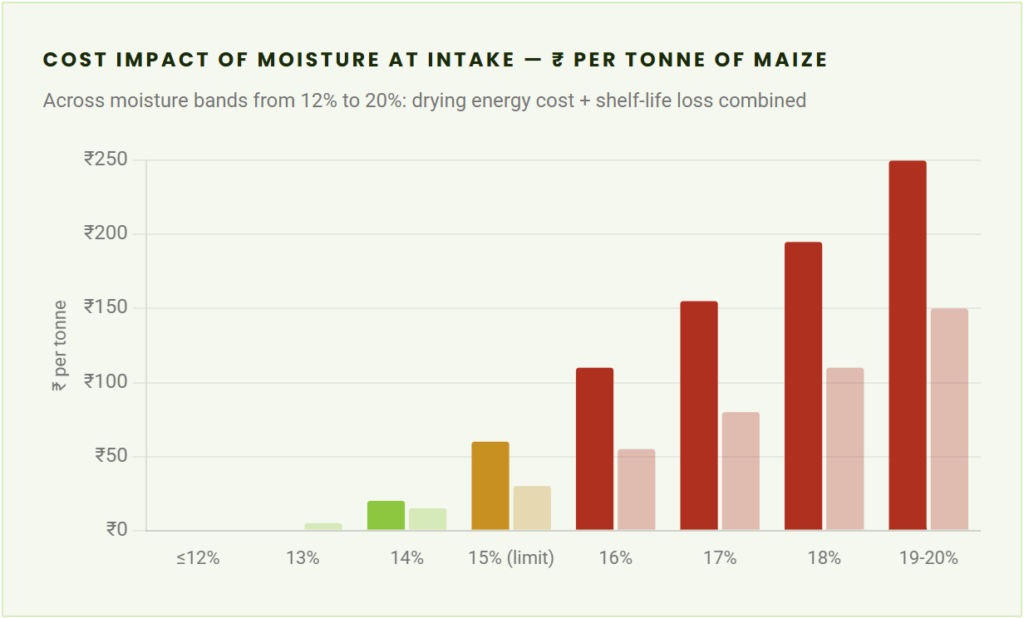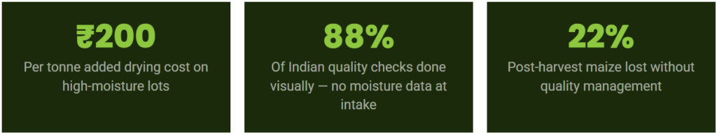 Maize purchased at 17–18% moisture looks identical to maize at 13%. The difference is invisible to the eye and to any visual quality check. Yet that 4-5% moisture gap translates directly into Rs. 150-200 per tonne in added energy costs for on-site drying, reduced shelf life in storage silos, and elevated aflatoxin risk during the drying process itself.