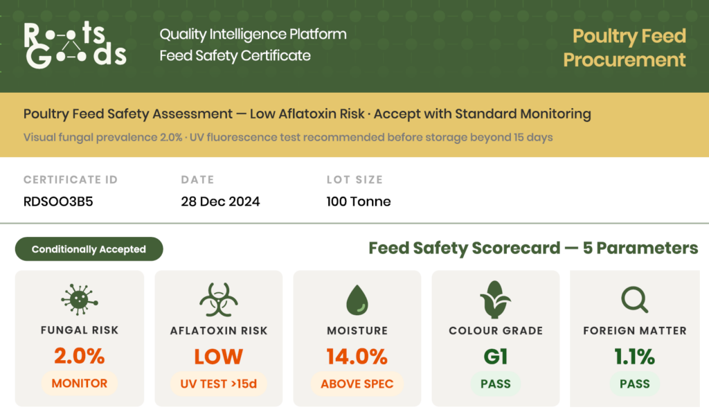 At RootsGoods, every maize lot entering our supply chain is scanned with NIR spectroscopy at the FPO gate. Moisture percentage is certified to within ±0.3% accuracy before the grain moves. Lots that exceed 15% moisture are flagged, held, and either returned or sun-dried at the FPO before dispatch thus, eliminating the problem at source rather than at your intake.