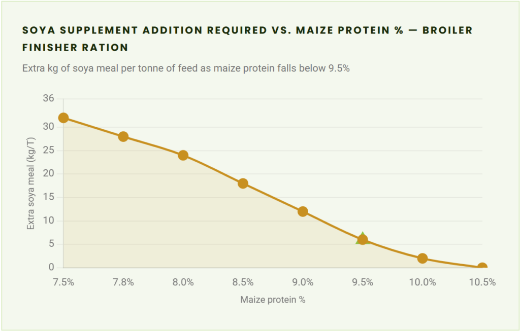 The solution is not to buy more expensive maize. It is to buy maize with a certified protein percentage so your nutritionist can formulate precisely rather than conservatively. A lot certified at 9.4% protein allows tighter soya inclusion. A lot at 8.2% demands a different formulation entirely.